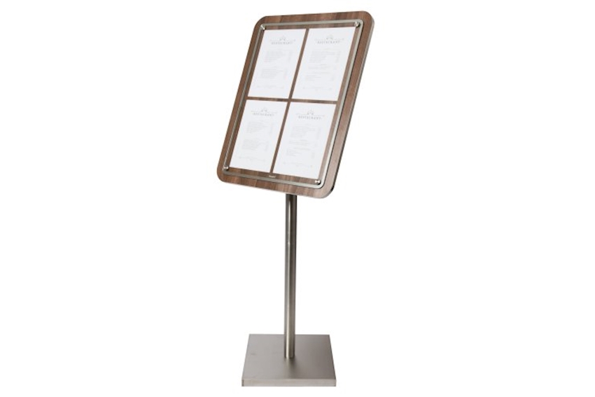 Infodisplay Wallnuss 4xA4 Sicherheitsglas, Hartholz mit Edelstahlrahmung, 57 x 75 x 3 cm für innen und aussengebrauch, Wandmontage oder freistehend (Edelstahlständer optional), Schrauben, Dübel inkl.