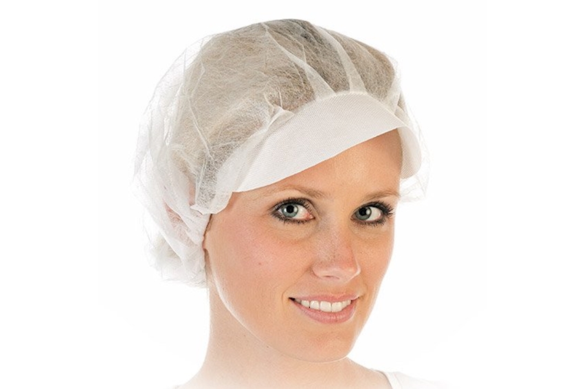 aus Luftdurchlässigem,leichtem Vliesstoff, mitSchild und EingenähtemElast-Band, für alleKopfgrössen passend, weiss