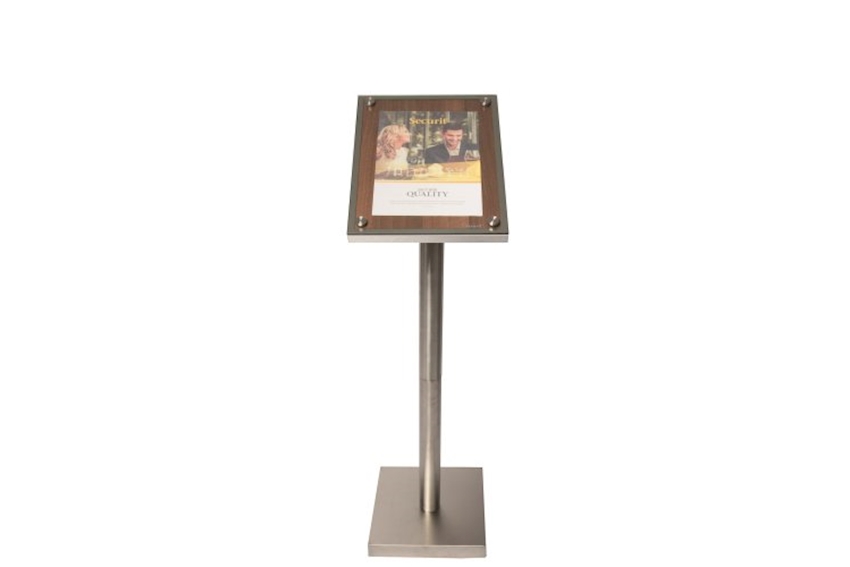Infodisplay Wallnuss 1xA4 Sicherheitsglas, Hartholz mit Edelstahlrahmung, 28 x 37 x 3 cm für innen und aussengebrauch, Wandmontage oder freistehend (Edelstahlständer optional), Schrauben, Dübel inkl.