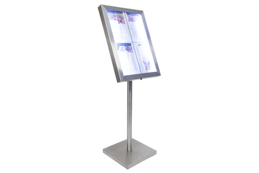 LED-Informationsdisplay 4 x A4 aus gebürstetem Edelstahl 53 x 70 x 6 cm, Wandmontage oder Standfuss ink. 5m langem Stromkabel oder mit Securitbatterien (nicht inkl.) Innen und Aussen geeignet