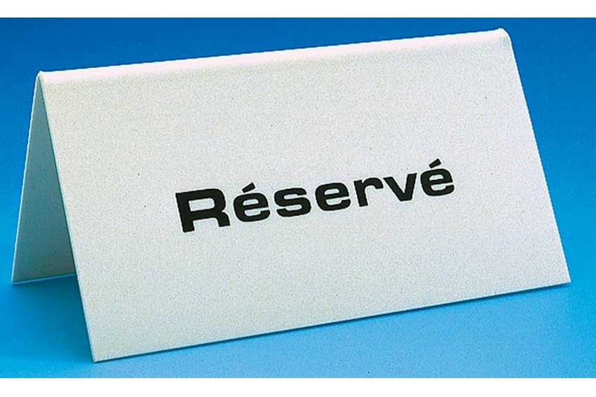 Tischständerchen 100 x 55/55 mm aus Gellu weiss 1 mm stark, beidseitig schwarz geprägt mit "Réservé"