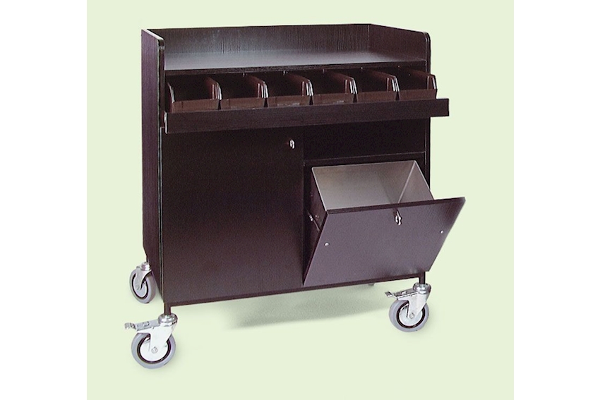 -bois -4 roues D=12,5cm -système de freinage sur 2 roues -avec poubelle amovible en acier col. noir -tiroir avec 6 range- couverts en plastique amovibles