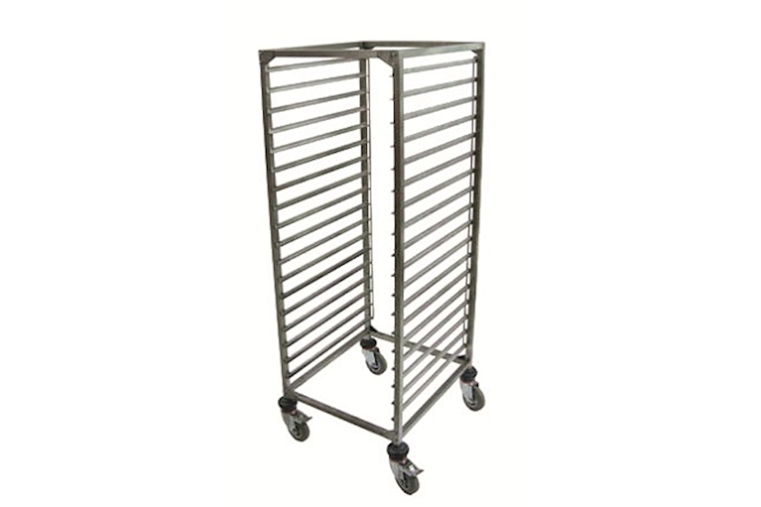 en acier spécial, avec 18 glissières doubles, pour 18 plateaux GN 2/1 (ou 36 GN 1/1), distance glissières 7.5cm, 4 roues pivotantes avec freins, 4 caoutchoucs anti-chocs.